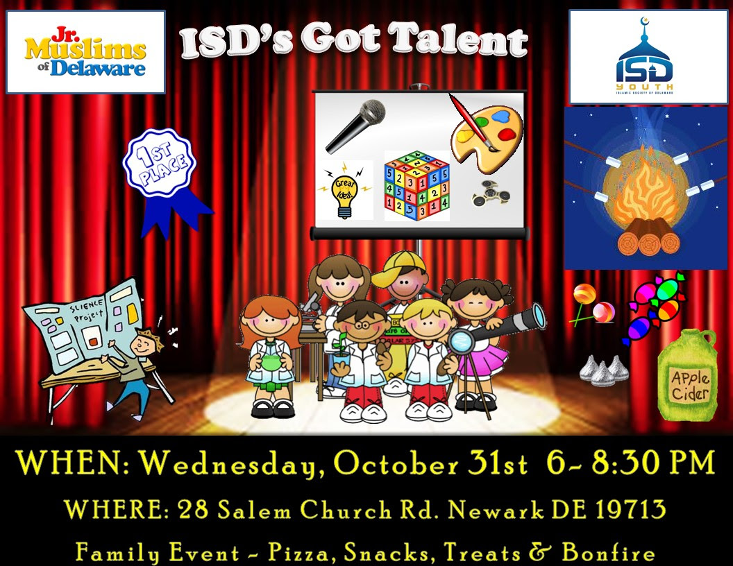 Islamic Society of Delaware Youth Group would like to invite the community for a fun-filled family night at ISD on October 31st from 6:00PM to 8:30PM. The program will begin with Jr. Muslims of Delaware and Youth Group showing their talents. A panel of judges will provide their comments and select a winner, who will receive a $50 gift card.