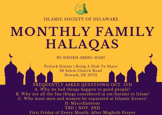 Come join us for the next Community Family Halaqa on Friday, October 5th at 7:00 PM, InShaa'Allah. Please bring your favorite dish to share with the community.